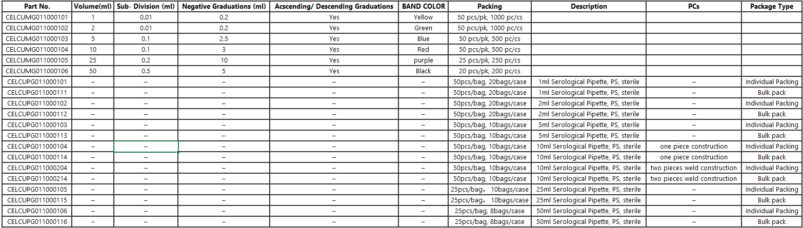 GVS offers serological pipettes in six different volumes, available individual pack and bulk pack, with general color code for each volume.